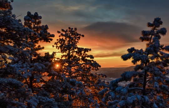 A while back, I was treated to a spectacular, fiery sunrise the morning after a few inches of fresh snow softly coated the pines near home.