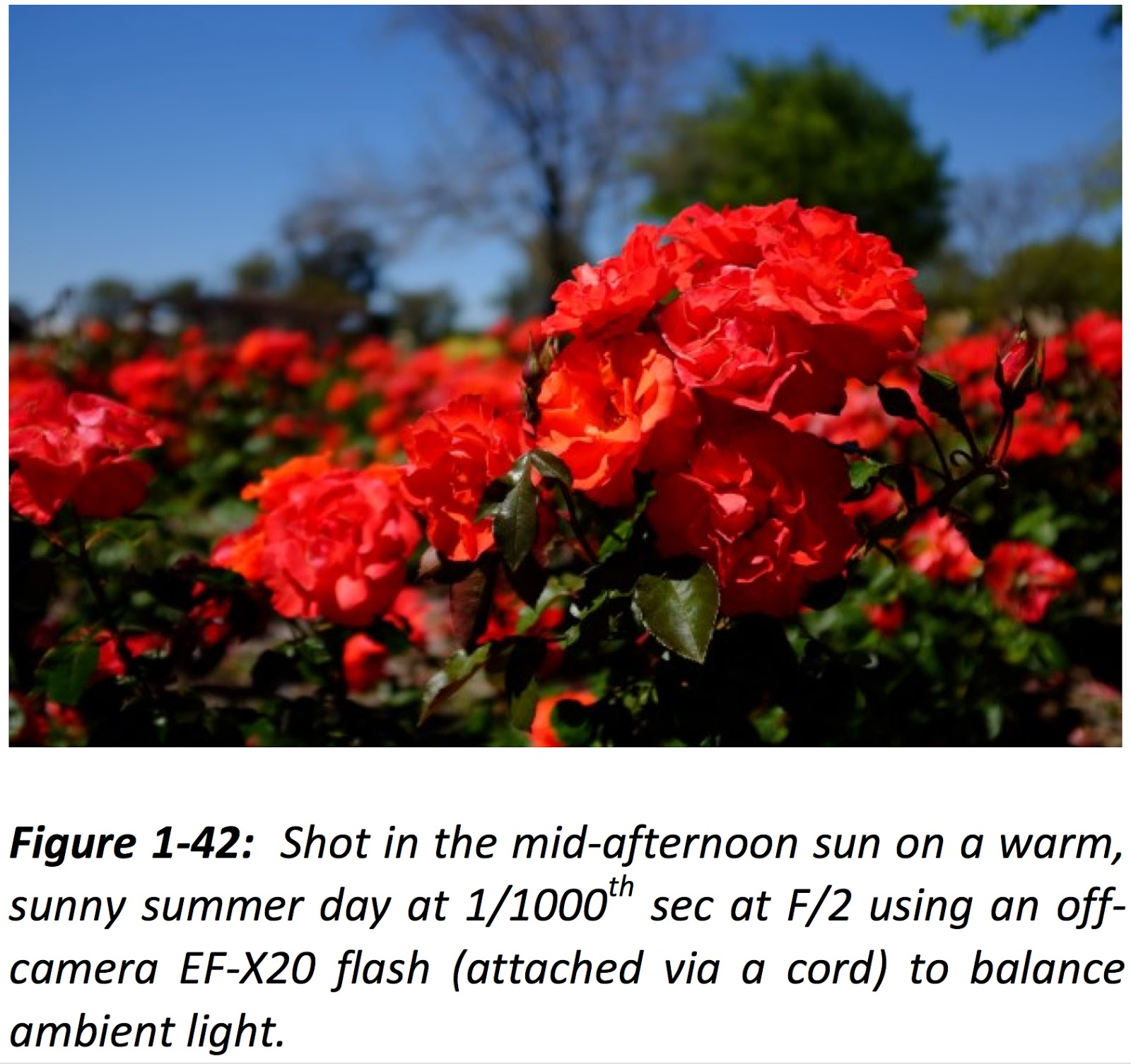 Want shallow depth of field with that?  Turn on the ND filter! Figure 1-42 demonstrates how this all comes together.  The high shutter speed (1/1000th) cuts ambient light giving me rich colours in the sky and trees.  The ND filter means I can shoot wide open (f|2 in this case) so only the cluster of roses in the foreground is in focus.  Add in the EF-X20 flash for some fill, and you produce a pleasing result in awkward lighting conditions.