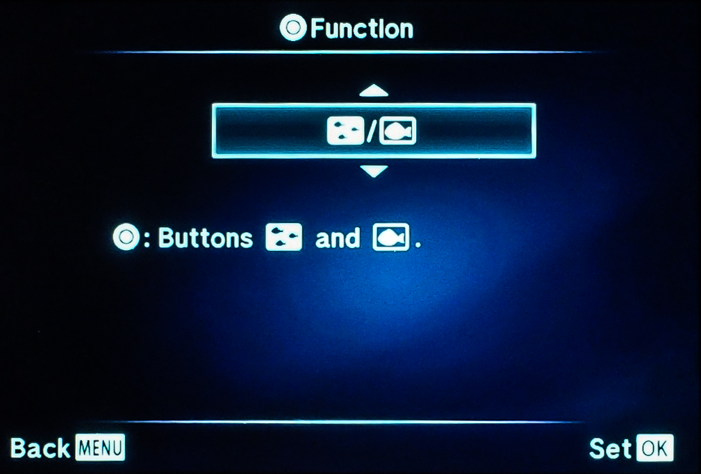 Underwater Photography isn’t something that a lot of us will use this camera for, but it’s a very nice feature for those who do.  And, of course, it must be assigned to a Button in order to be used.  First, it tries to optimize the camera settings for shooting underwater, plus it allows the kit flash (the FL-LM2) to fire while in the down position, and also lets you zoom a lens with electric zoom (12-50mm), with a button push … nice things to be able to do when your camera is locked inside a waterproof housing.