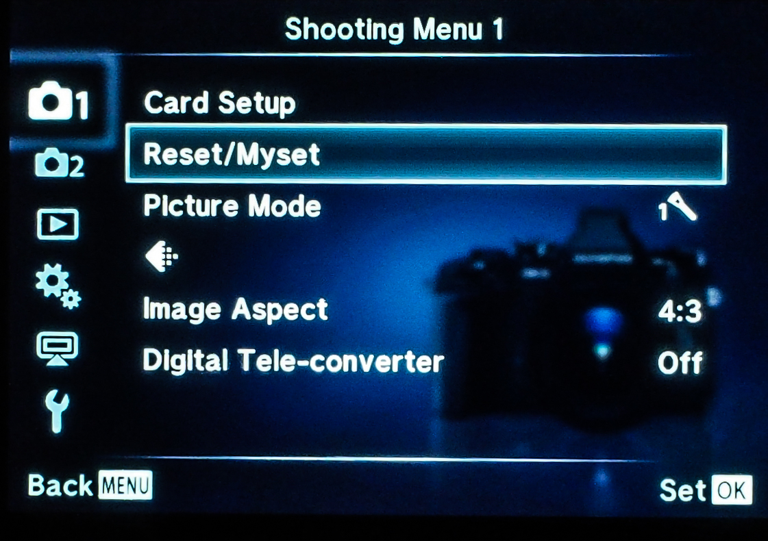 The other change I’ve made back here is to the Fn1 Key which I set to activate “Myset1”. The E-M5 allows us to memorize 4 different sets of camera settings for different situations. So far, I’ve only set Myset1 to be used for AEB (Auto Exposure Bracketing).