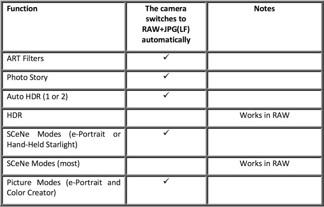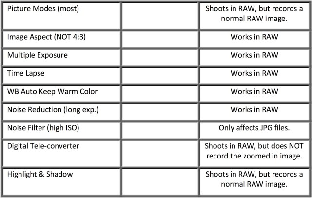 The E-M1 offers many advanced bells-and-whistles, which are not all compatible with RAW mode. And the ones that don’t support RAW, will (sometimes) silently switch to RAW+JPG (LF) shooting while you use them and then switch back when you’re finished. Which features are incompatible with RAW, and how does the camera behave for each? A comprehensive table appears below:
